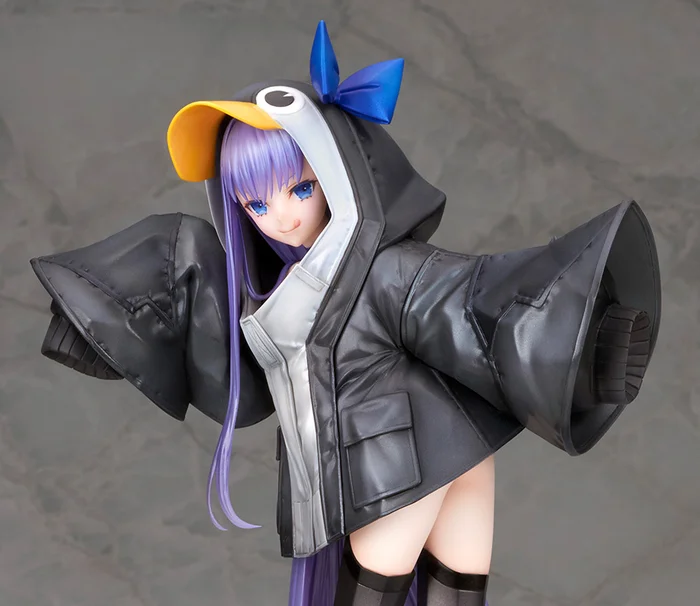 The winds of Las Vegas are calling. They whisper the name… Mysterious Alter Ego Lambda! Alter introduces Mysterious Alter Ego Lambda in 1/7 scale. The Lancer-class Servant from Fate/Grand Order is the spitting image of her official artwork, with the shading and stitching details of her penguin outfit masterfully conveyed in figure form. Because of the way she’s posed, her oversized jacket is hiked up, allowing you an ample view of her thighs, and then some! Her silky, shiny light purple tresses of hair fall all the way to the floor, sharing the spotlight with an optional bow-tied penguin! Her ice celebrity shades are equally optional.