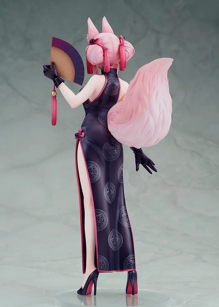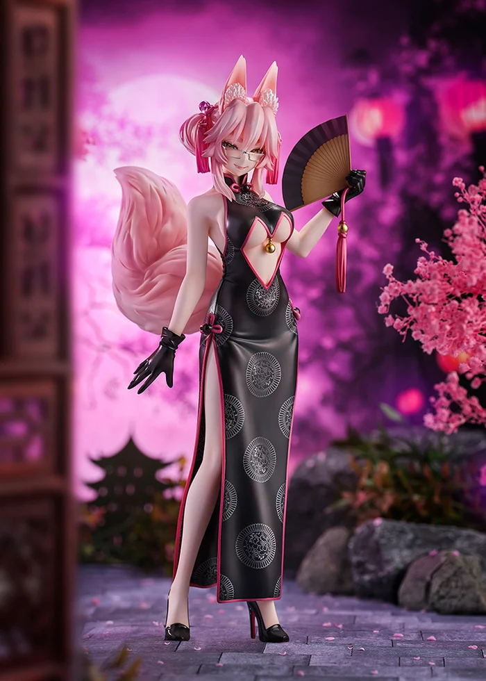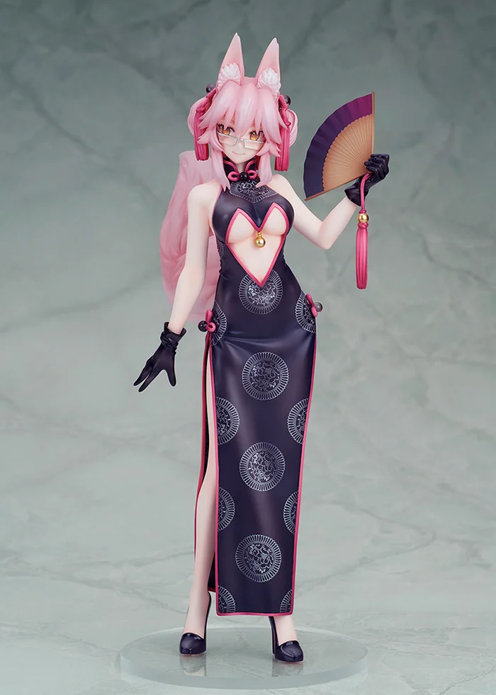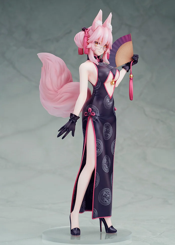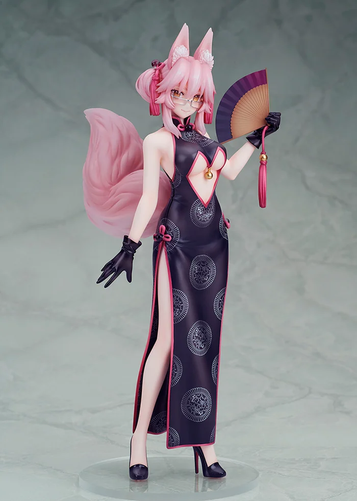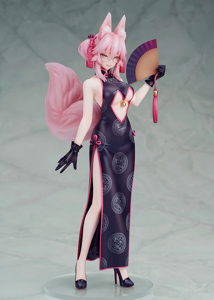 Sculptor mishima and manufacturer Flare are heating things up with this dazzling new figure of Tamamo Vitch Koyanskaya from the Fate/Grand Order series! Standing at 10.8″ tall and 1/7 scale, Koyanskaya is adorned in a black Chinese dress. The heart-shaped cut of her dress exposes her bust and her torso, and the high slits of her skirt show off her amazing legs. As her tail puffs up, she offers a flirty smile behind her glasses (or a normal smile, depending on which face plate you use). Apparently, she’s even making herself hot, because she’s cooling off with a traditional hand fan! Please be merciful to us, Miss Tamamo Vitch!
