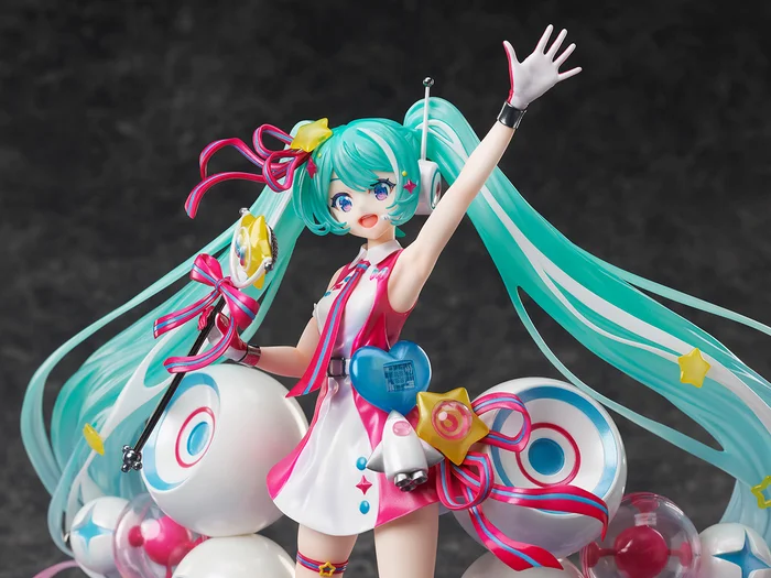 The main visual to the “Hatsune Miku Magical Mirai” 10th anniversary event by popular illustrator KEI has become a 1/7 scale figure! Produced by Design COCO, Miku is captured at 10.2″ putting on a performance for her fans as she smiles brightly and gives an energetic wave.