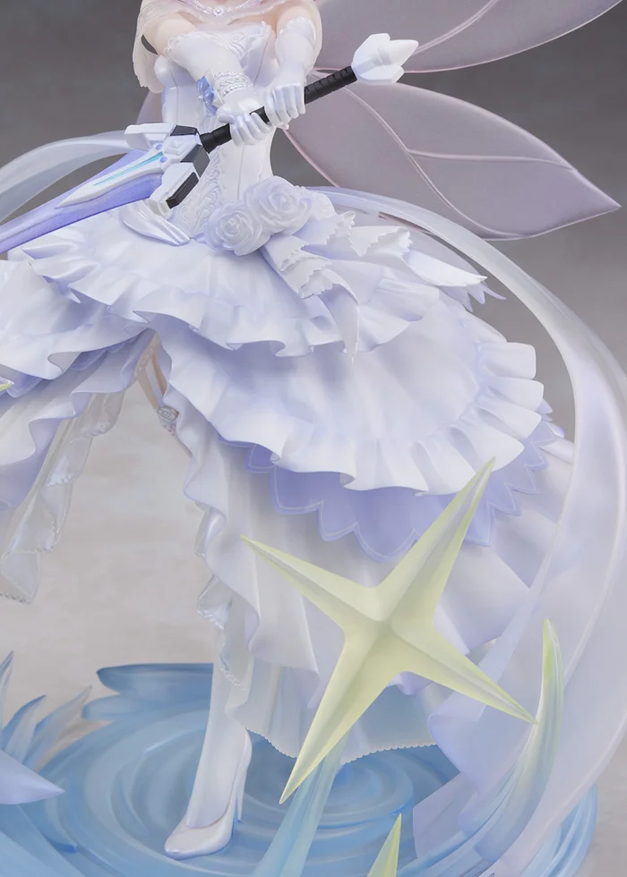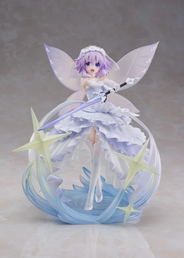 Fans can now enjoy the third Hyperdimension Neptunia OVA Hidamari no Little Purple on Blu-ray, and best of all, this Limited Edition set comes with a 1/7 scale figure of Little Purple wrapped in the radiance of the Share Crystal! Produced by Broccoli and sculptor Honoka, she wears a gorgeous pure white dress and has a whimsical appearance as she wields her ceremonial sword. Her dress looks fantastic with its layered ruffles, lace, and floral details, and her fairy-like wings are made with translucent parts as is the detailed base, which swirls up around her, completing the beautiful composition. Also included is an alternate face part, and for a more daring look, you can even remove her veil and skirt!