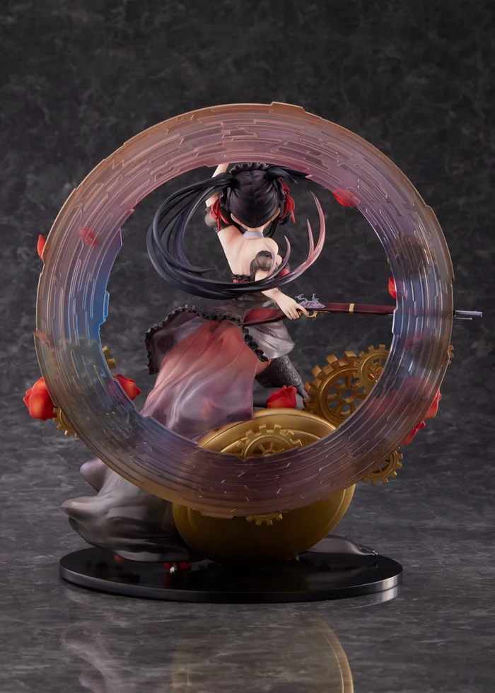 What time is it? It’s time to pick up a gorgeous Kurumi Tokisaki figure! Through Spirit technology, Taito and Spirtale have successfully combined lingerie and swimwear into a sexy, eye-catching number worn by the Date A Live IV heroine! Her black dress is made of translucent material so you can slightly see her body through it! Her hair also features translucent parts, shaped into a near perfect circle from the momentum of her body. A golden clock and golden gears are decorated with red roses of every size behind Kurumi, a reference to her incredible powers! And as expected, the Spirit is double-fisting two deadly guns. Talk about a wild date!