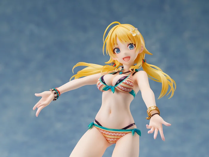 From Licorne and sculpted by Anna of Licorne comes this 1/7 figure of Meguru Hachimiya from The Idolm@ster: Shiny Colors. Measuring 9.1”, she is posed as she appears on her SSR Natsu Ni Koisuru Pizzicato card and even comes on a water effect base to complete the pool park atmosphere. Her hair bounces with her movement as she splashes around in the water and smiles brightly. Not only has her bright orange and teal bikini been perfectly brought to life in 3D form, which also shows off her curvy figure, but even her jewelry, hair ties, and flower in her hair are spot on to the card illustration. Heat up your collection with her summer vibes!